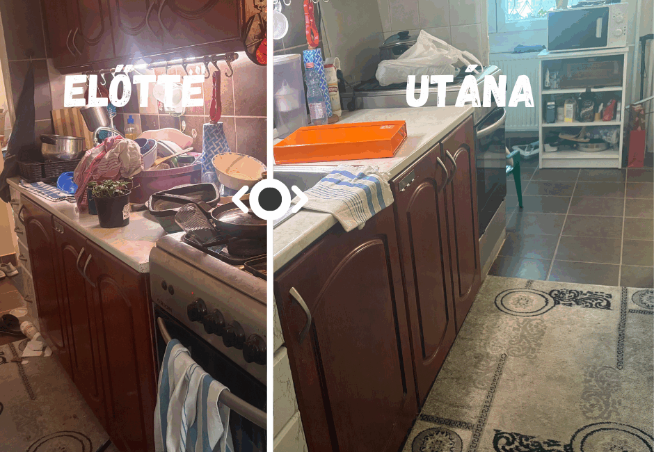 A képen egy konyha takarítás előtti és utáni állapota látható. A bal oldali fotón a helyiség zsúfolt, mosatlan edényekkel és felhalmozott tárgyakkal teli, míg a jobb oldalon egy rendezett, tiszta és higiénikus konyha látható.